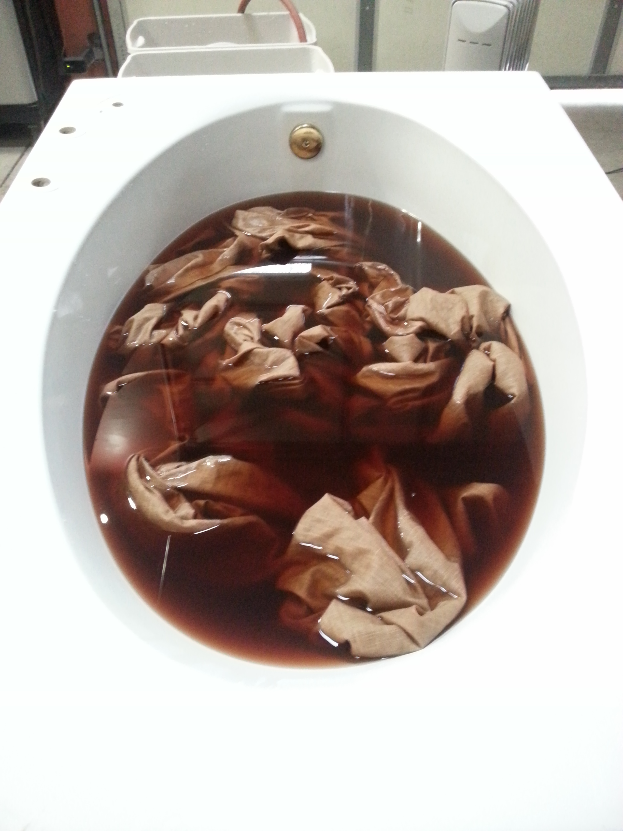 My latest challenge in the studio has me thinking big! I was asked to Ombre dye 2 panels of linen (24 feet each) a navy blue color. But first, the panels needed to be dyed a natural color…so, here is the linen soaking in its tub. The first image note the amount of color in the water…the second image, note the amount of color in the linen 🙂