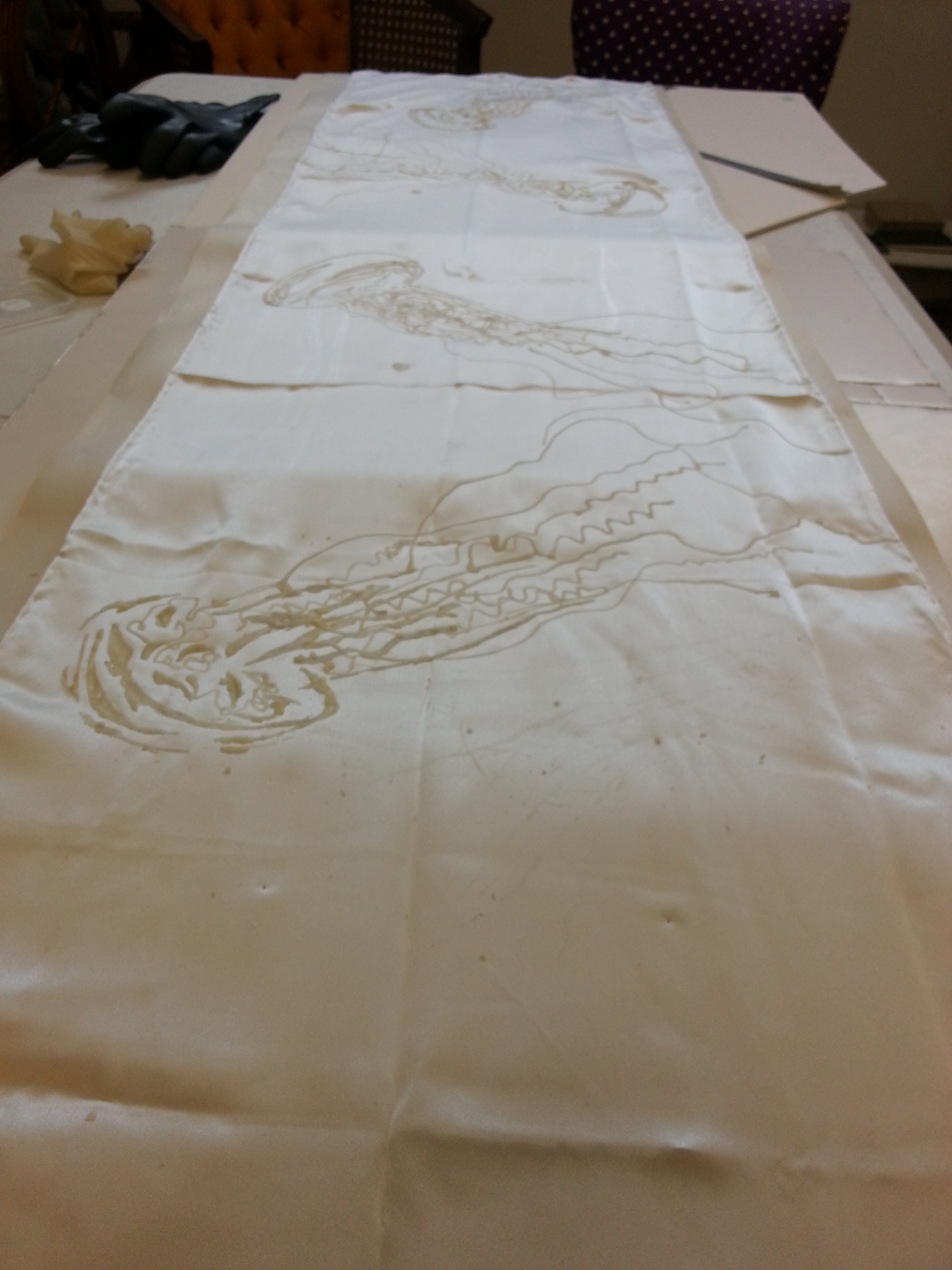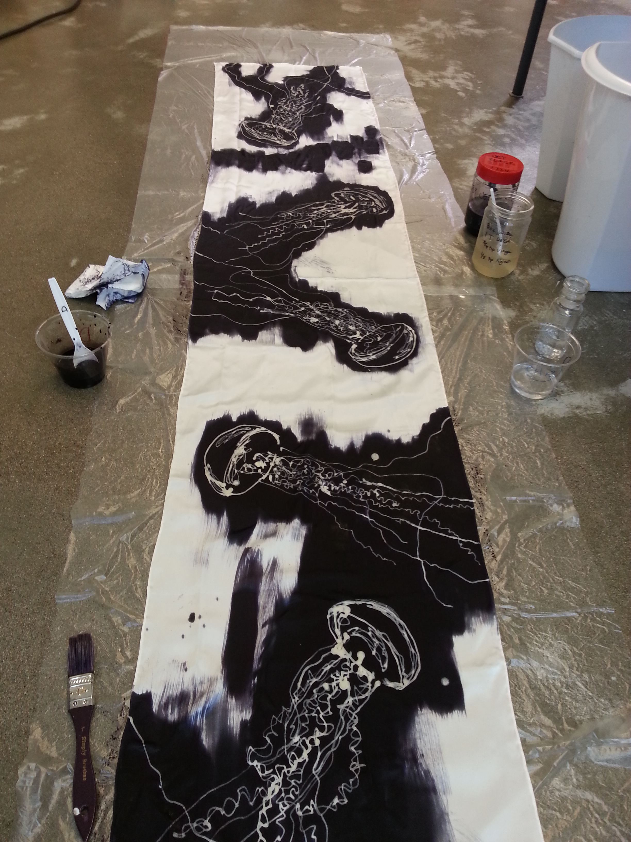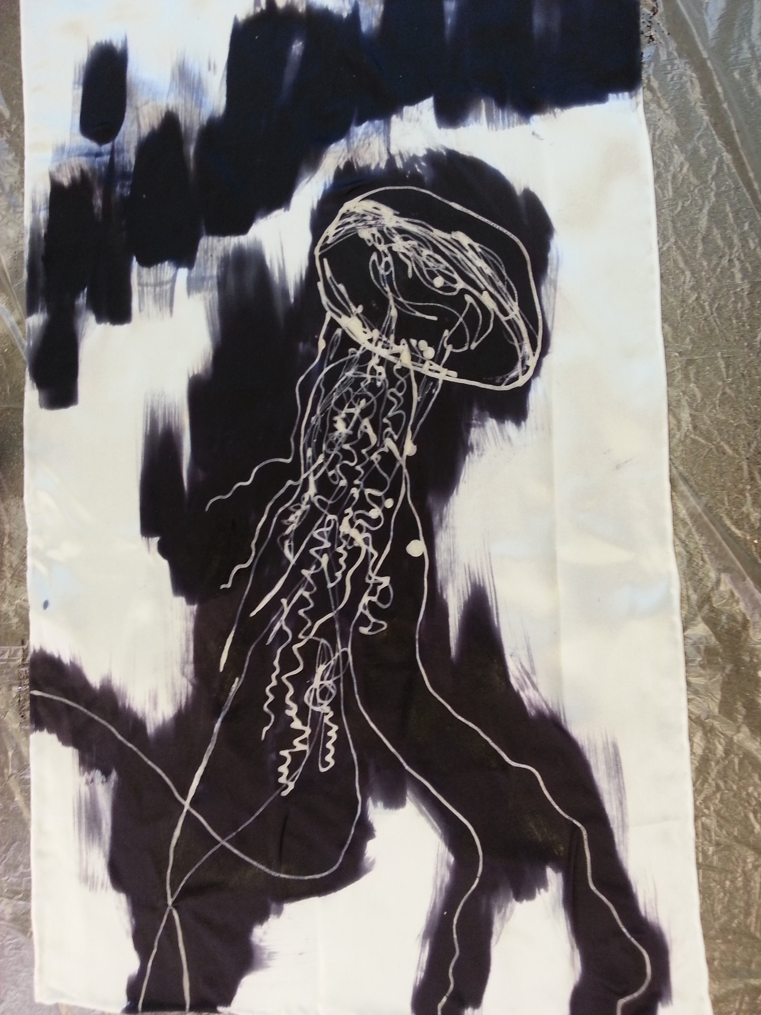 I’ve been playing with wax and dye in the studio! I use a tool that holds a well of hot wax to draw on the silk scarf. Then I thicken my dye and paint it on with a big fat paint brush. Next I wrap the scarf up in paper and steam it. After it cools, I wash it in hot soapy water.