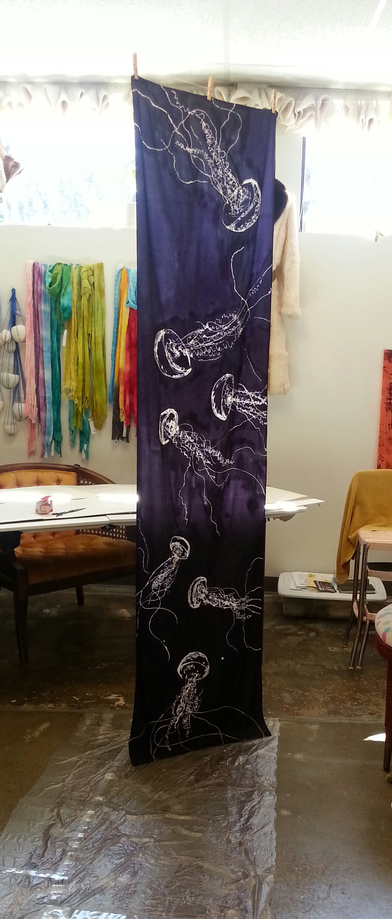 And here’s my finished black and white jellyfish scarf… I used hot wax for a batik process then steamed the silk charmeuse scarf to set the dye and transfer the wax to the paper wrap. I’m really delighted with the way it turned out and can’t wait to play some more with the wax! In fact, I have an order of silk coming in this week…