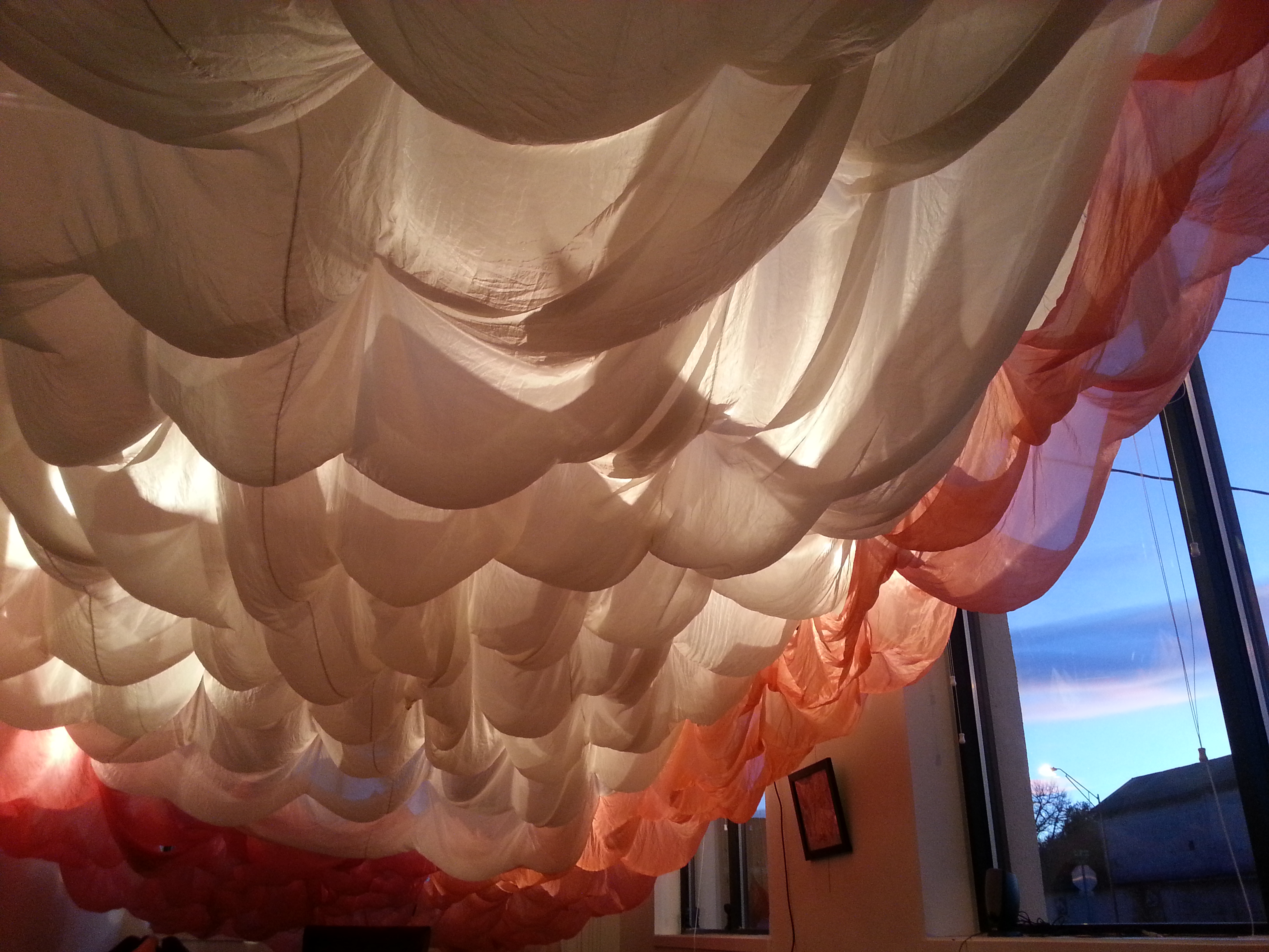 Good afternoon all! If you haven’t had the chance to swing by Artworks Loveland to see my latest suspended silk installation art piece, there’s still time! Come on over from 6-9 pm tonight to see the piece, falling up, check out the fabulous new show by Tedi Jensen, view Bob Campagna’s photography show, and see my new video piece (in the dark hallway).